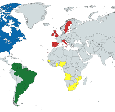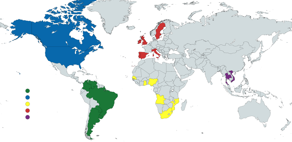 Brasil • Uruguai • Argentina • Paraguai • Colômbia • Venezuela • Estados Unidos • Canadá • África do Sul • Moçambique • Angola • Nigéria • Ghana • Senegal • Itália • Espanha • Portugal • Reino Unido • Irlanda • Suécia • Thailândia • Vietnã.